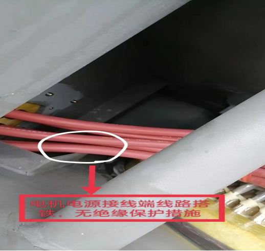9月8日上午檢修電儀負(fù)責(zé)人周福和互保對(duì)子朱江華正常巡視到球團(tuán)脫硝增壓風(fēng)機(jī)處時(shí),施工人員正準(zhǔn)備對(duì)風(fēng)機(jī)電機(jī)頂部進(jìn)行封蓋。出于職業(yè)的本能反應(yīng),兩人快速對(duì)封蓋前的風(fēng)機(jī)電機(jī)內(nèi)部進(jìn)行最后一次安全檢查,檢查發(fā)現(xiàn)風(fēng)機(jī)內(nèi)部兩處重大設(shè)備安全隱患。第一、高壓電機(jī)電源端線路直接緊靠在金屬棱角邊緣,風(fēng)機(jī)電機(jī)屬于高壓大功率設(shè)備,在運(yùn)行中受到煙氣流量流速,壓力喘振等因素會(huì)產(chǎn)生振動(dòng),如果電源線不進(jìn)行絕緣處理長時(shí)間運(yùn)行,會(huì)導(dǎo)致絕緣外皮破損產(chǎn)生搭鐵短路放炮事故。