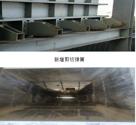 檢修班在接到任務(wù)后,立即對該問題產(chǎn)生的根源進行梳理,對卸料應(yīng)力進行計算和綜合分析,在確保徹底消除隱患、穩(wěn)定可靠、簡單易行和力爭最低成本的原則下研究可行性技改方案,決定采取四管齊下 1.在每個石膏倉與框架接觸部位均布增設(shè)剪切彈簧10個(使應(yīng)力緩釋)。2.將倉內(nèi)錐段原不沾板改為不銹鋼板(滿焊)并直段噴涂鱗片樹脂(使石膏緩降,減小沖擊并消除腐蝕)。3.在真空泵出口增設(shè)減震膨脹節(jié)(隔斷設(shè)備運行震動)。4.繼續(xù)對卸料空氣炮深挖潛能進行技改(以致順暢下料)。