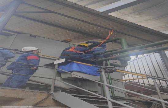 2023年4月14日系統(tǒng)停機,生產班監(jiān)護檢修班組檢查風機,相關的防護措施做到位。